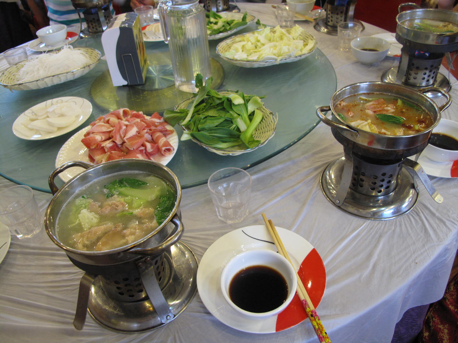 얇게 썬 소고기를 끓는 육수에 익혀 소스에 찍어먹는 훠궈요리